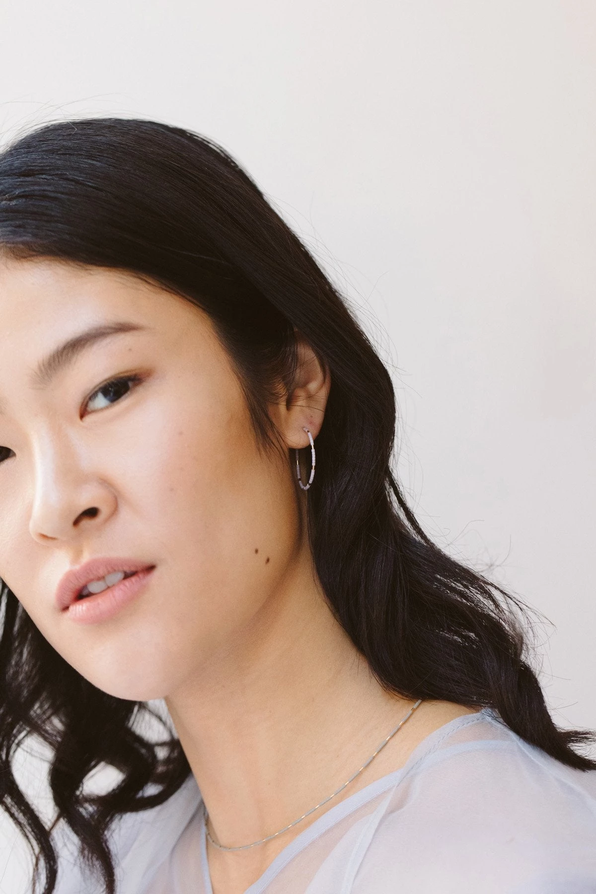 The combination of delicate 14k gold-filled hoops and matte glass beads gives these earrings a sophisticated look. The rain color is a darker blue-gray bead with a chic atmosphere. They are small in size and light in weight, making them suitable for everyday wear. The simple design gives a bright impression around your face.