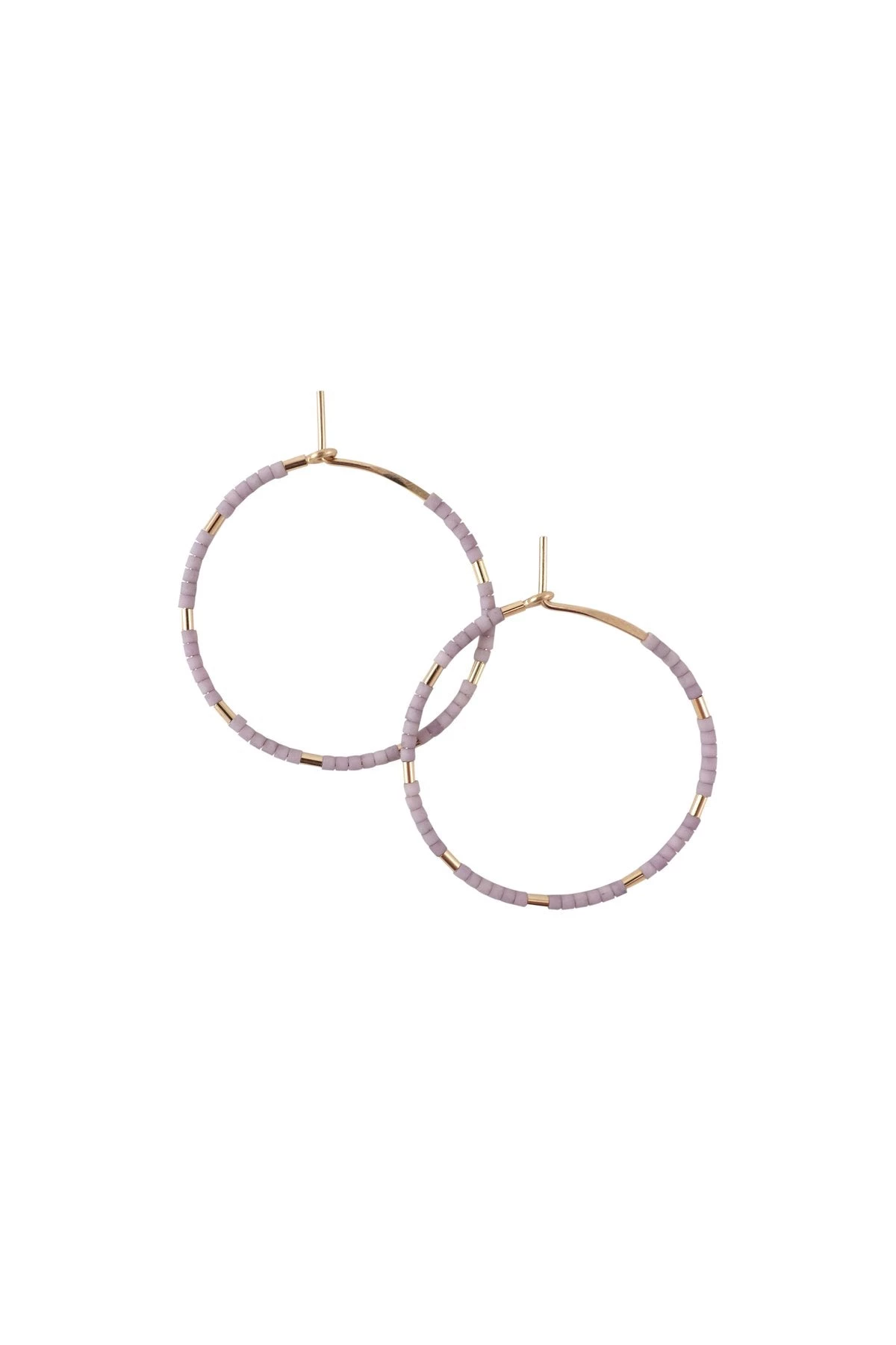 The combination of delicate 14k gold-filled hoops and matte glass beads gives these earrings a sophisticated look. The Wisteria color is a bright purple with a hint of blue, and would be a great addition to basic coordinates such as gray or brown. The earrings are small in size and light in weight, making them suitable for everyday wear. Although it is a simple design, it will give a bright impression around your face.