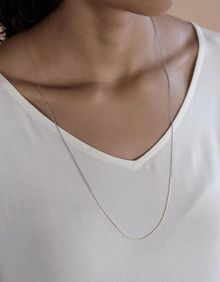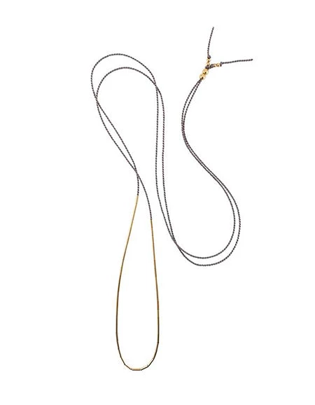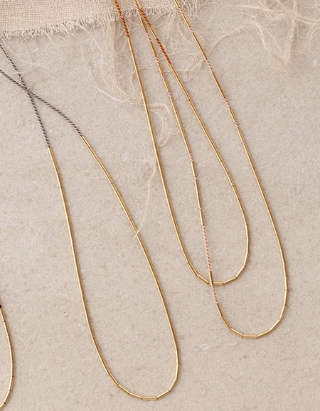 A long necklace made of silk cord threaded with gold-filled tube beads. The tube beads can be slid and moved, so you can connect them to make a beautiful gold line, or move them around to place them in various positions. The length of the necklace can be adjusted by moving the position of the beads at the back. You can change the length depending on your coordination. Wear it with a simple T-shirt or sweater. The slightly darker gray color is chic and can be worn with any outfit.
