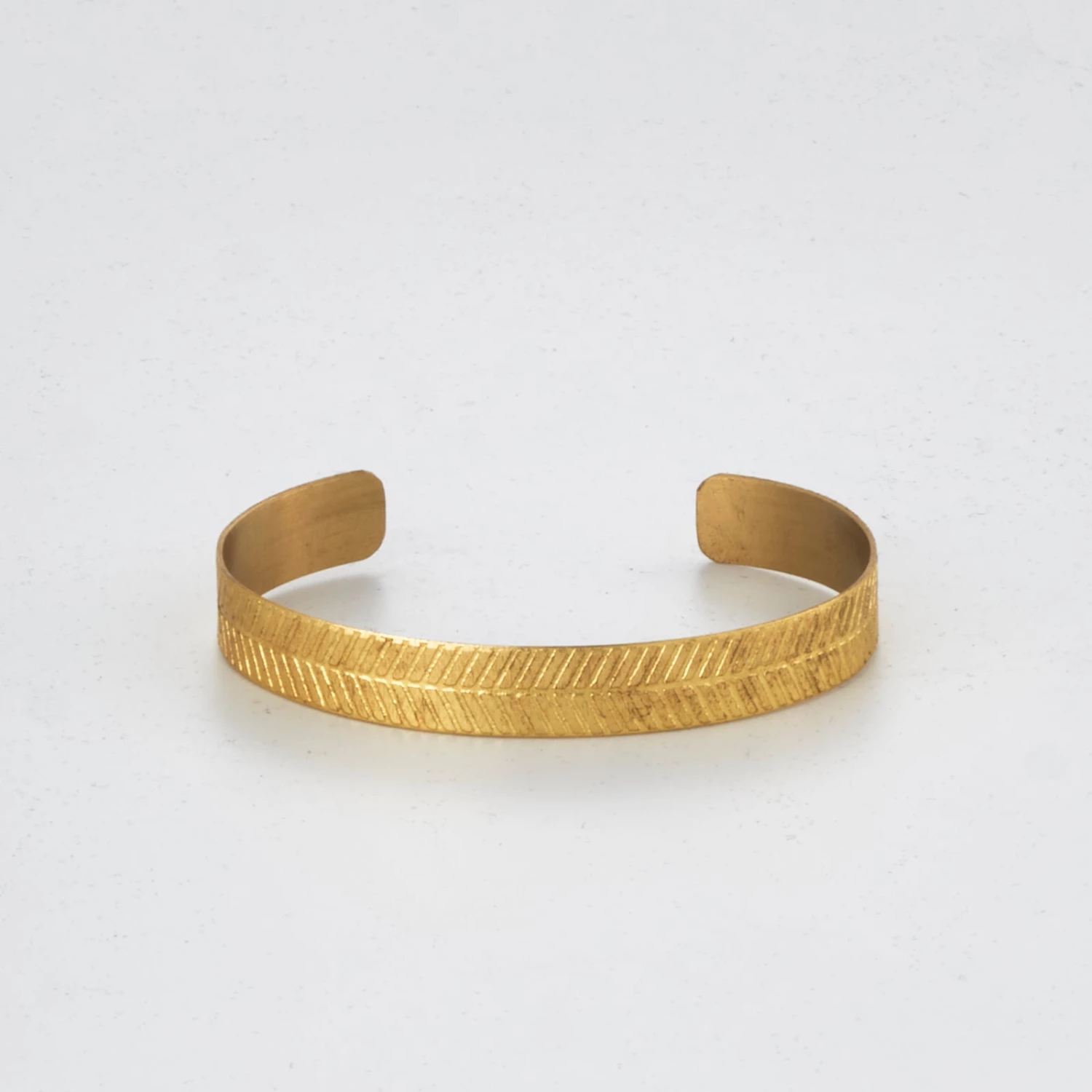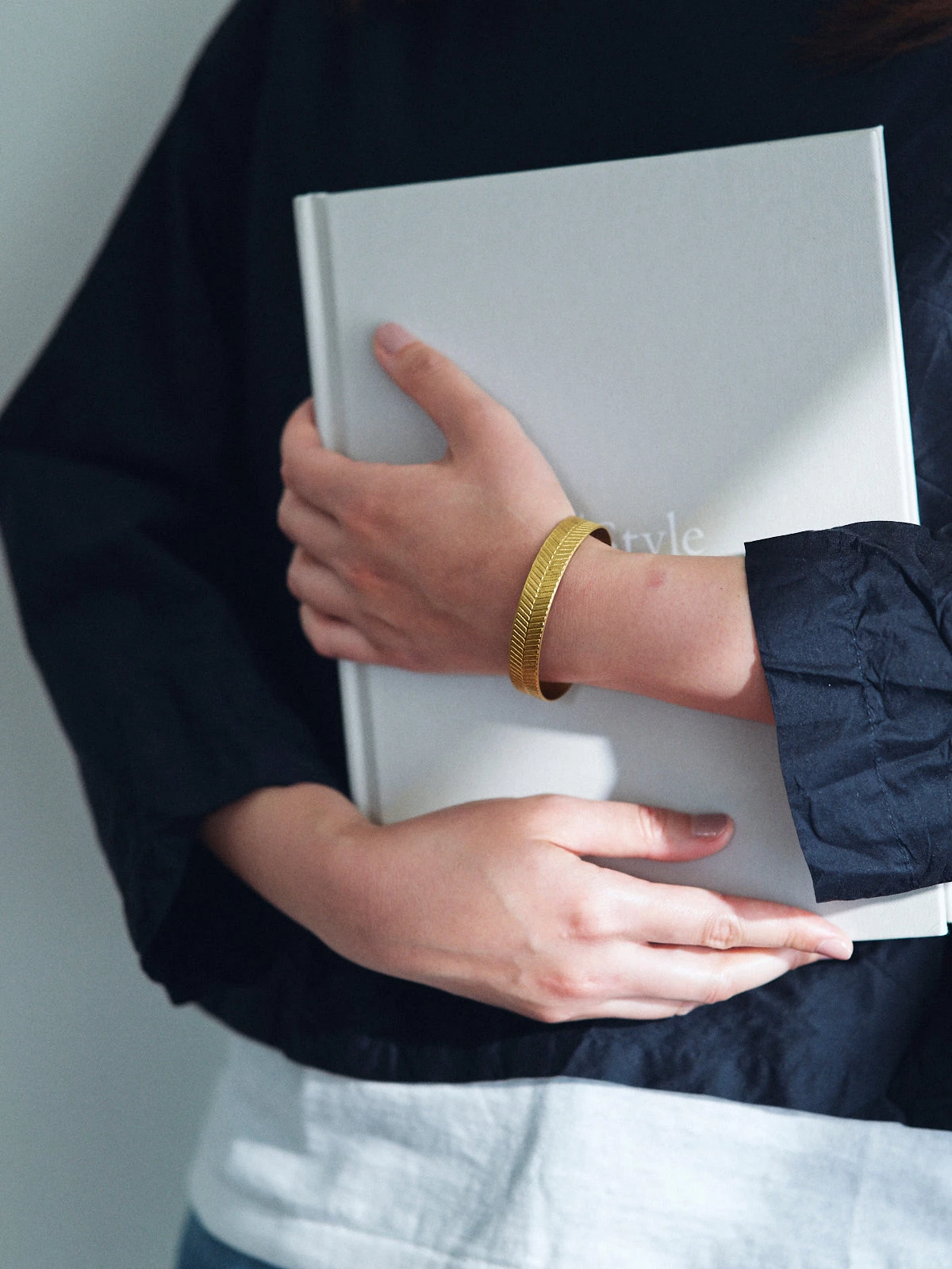 A bangle-shaped Brass bracelet with a herringbone pattern throughout. The narrow type goes so well with both casual clothes and chic stylings! For both women and men.