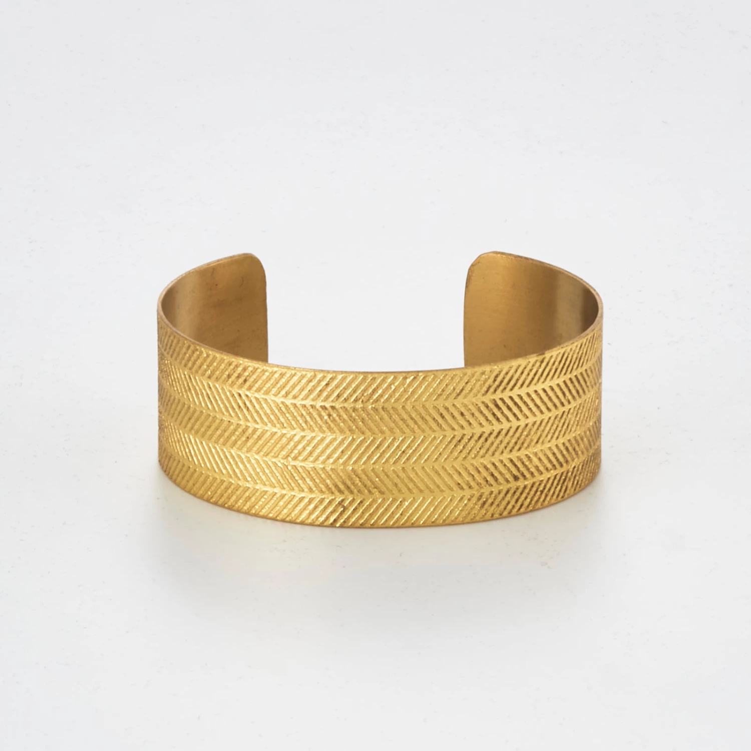 A bangle-shaped Brass bracelet with a herringbone pattern throughout. The wide type has such a lovely presence and it will make a lovely accent for styling, for sure! For both women and men.
