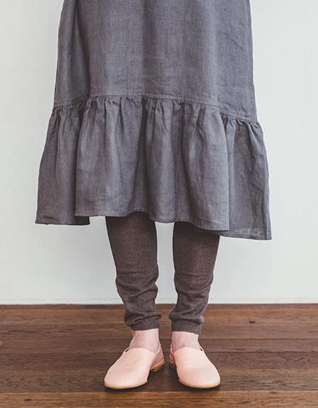 A light-weight linen legging meant to add an extra layer of warmth and/or texture. There is a comfortable elastic waist and the leg tapers to a subtly gathered cuff at the ankle. As the fabric is a fine knit and a bit sheer, these are truly intended to be worn as an under-layer.   Beautifully made in Japan.