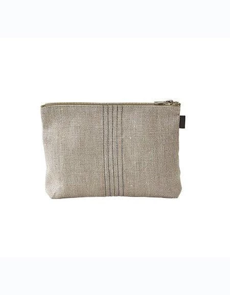 A roomy, all purpose zip pouch with embroidered detail at the front and leather tab at the side. Sewn up in Fog’s heavier weight linen.