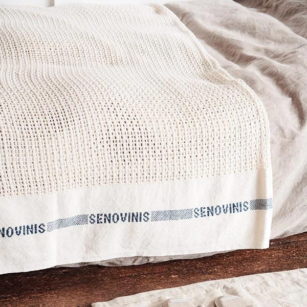 Soft and cosy cotton blanket by Japanese designer Yumiko Sekine. Loose honeycomb weave and large border with a navy blue stripe. Simple and luxurious, it is made of very soft, unbleached cotton: a pure pleasure as a throw on the bed or to relax on the sofa with a good book and a cup of tea…
