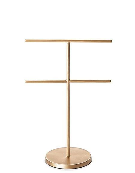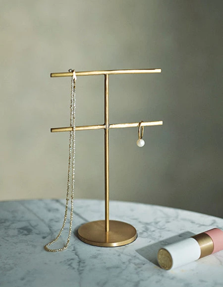 A handy stand in warm brass to keep earrings, bracelets and necklaces visible and ready-to-wear.