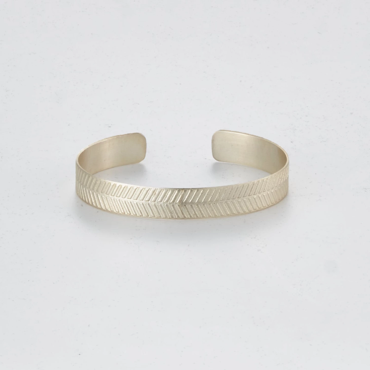 A bangle-shaped bracelet with a herringbone pattern throughout and a silver-plated brass finish.