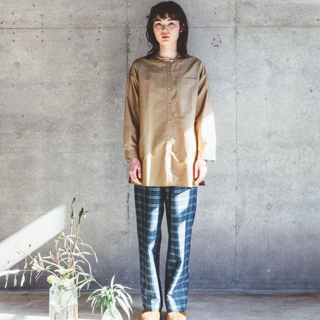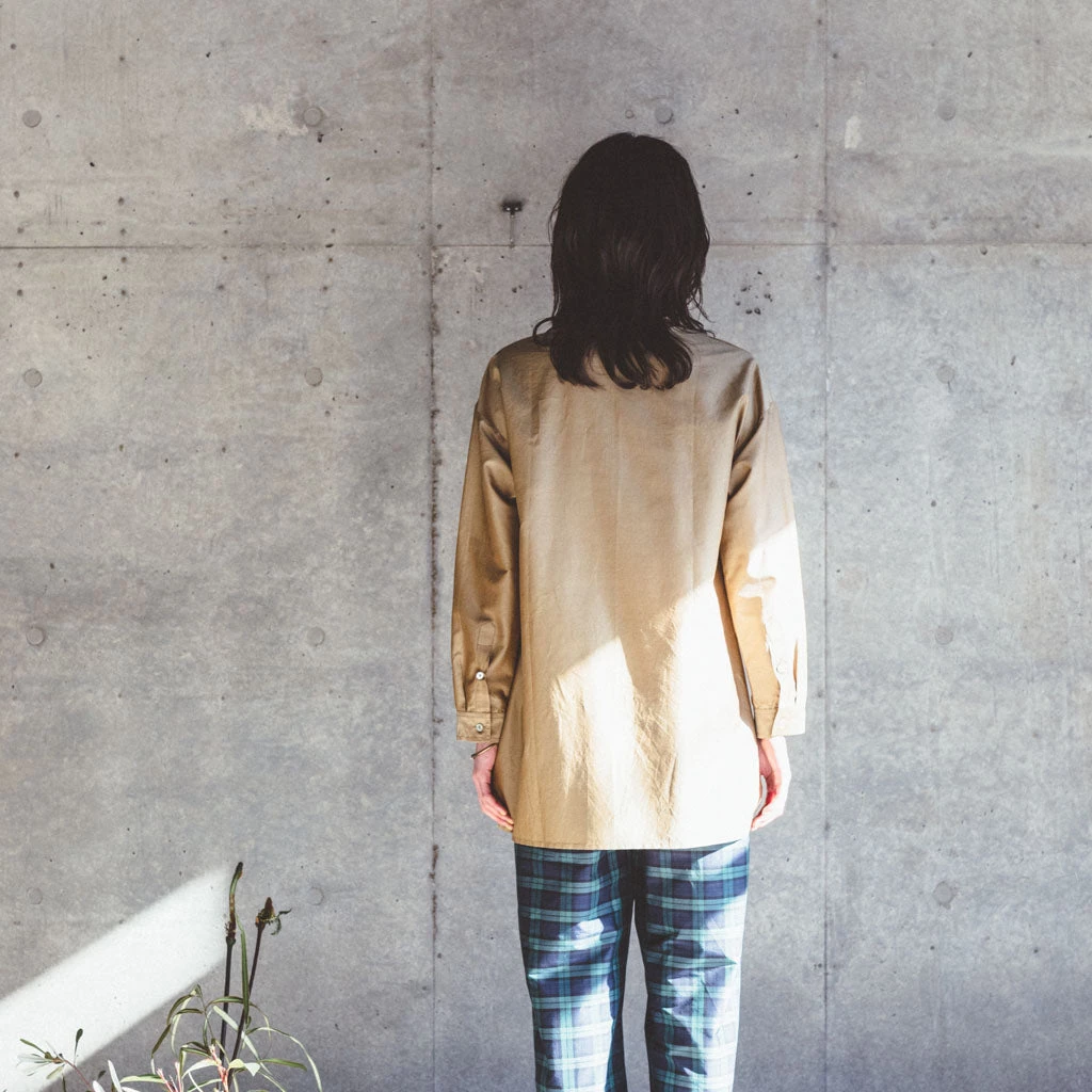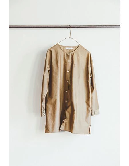 Damini is a long, buttoned-down shirt with simple round collar. It has also two buttons at the wrist. As you can see on one of the pictures, it combines beautifully with the Dipti top, thanks to its extra-long length. In beige color.