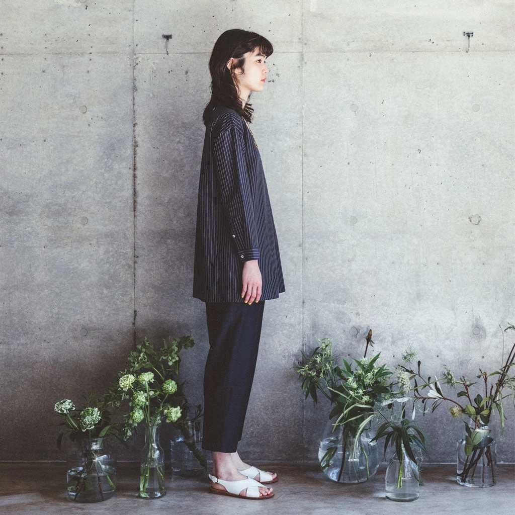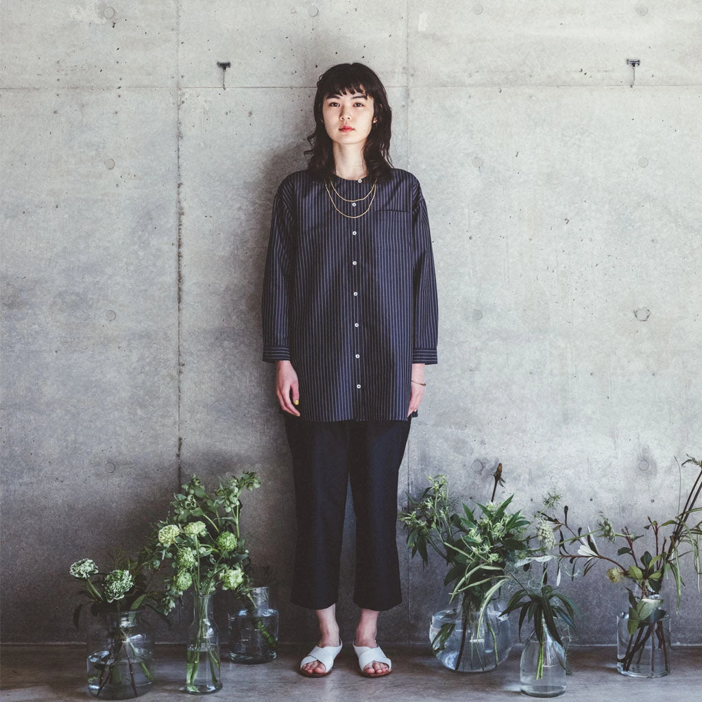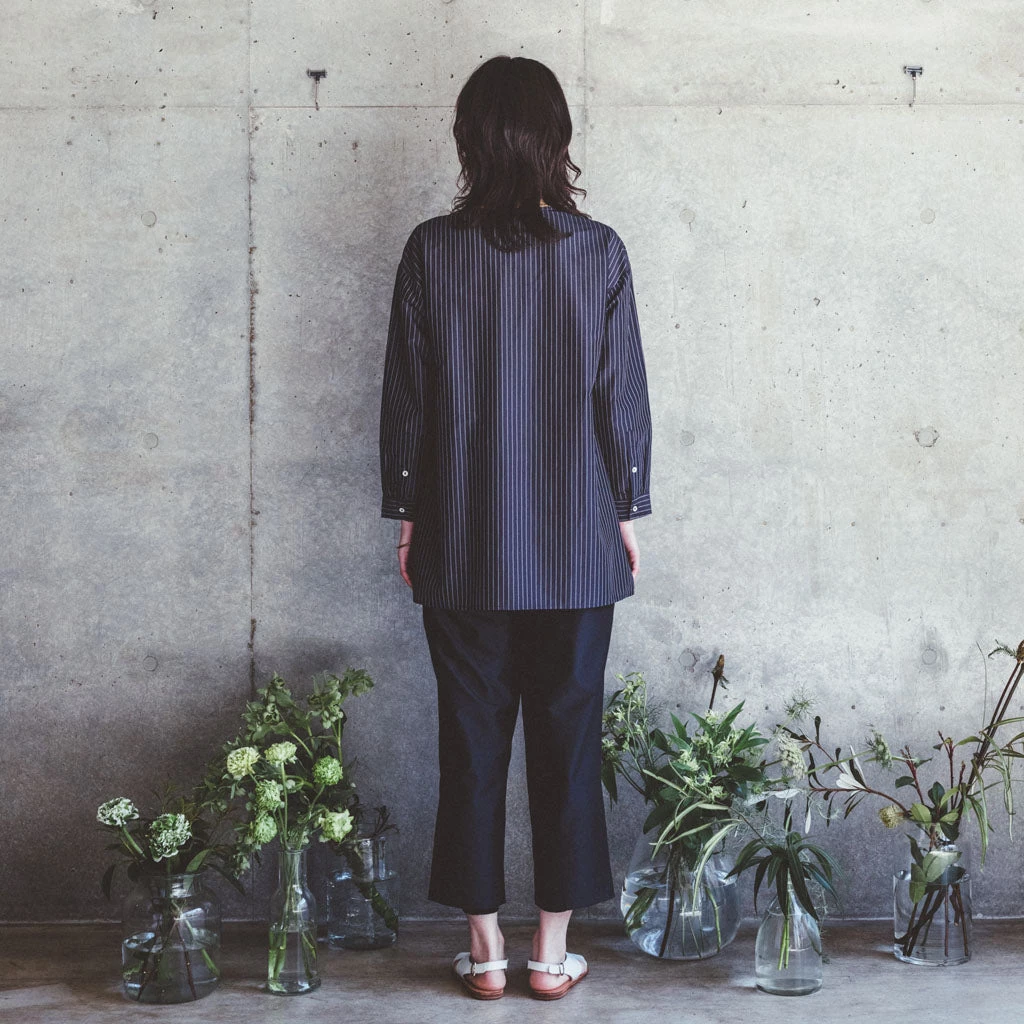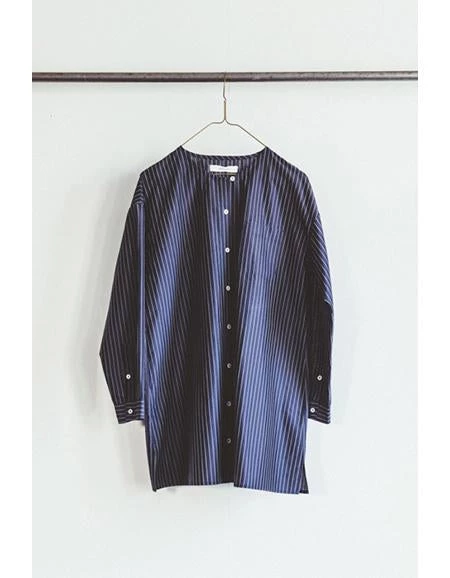 Damini is a long, buttoned-down shirt with simple round collar. It has also two buttons at the wrist. As you can see on one of the pictures, it combines beautifully with the Dipti top, thanks to its extra-long length. In navy color with thin white stripes.Â