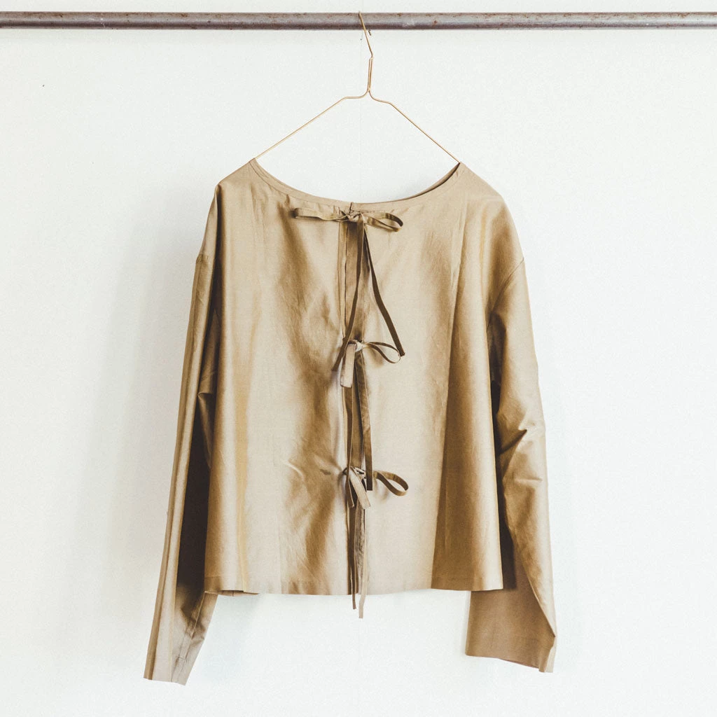 Dipti top with ties can be worn either with ties in front, or with ties at the back. Very nice simply worn over a t-shirt or a tank top; but also over a shirt, for a more elegant style. In beige color.
