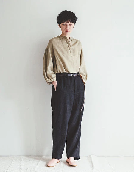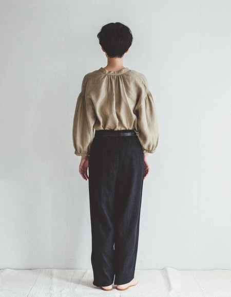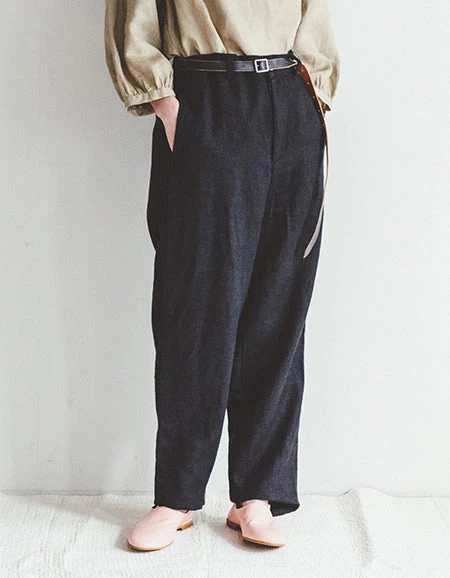 A high waisted trouser style pant with a tailored fit. Belt loops and a shell button at the waist, with a zip fly. Dart details at the back waist. Straight legs that taper at the cuff. On seam pockets. In a heavier weight linen. *slim through waist and hips.