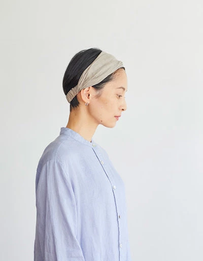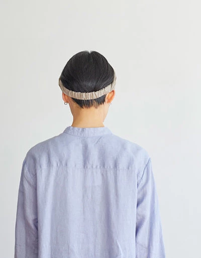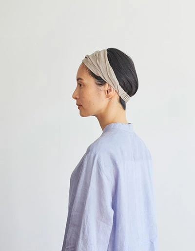 Beautiful and useful band of gathered linen with a comfortable elastic to hold it in place. Perfect tidying up those loose ends whilst exercising, washing up, or just concealing a ‘bad hair’ day.