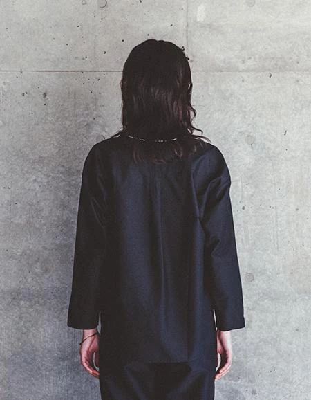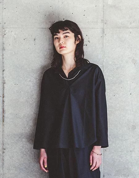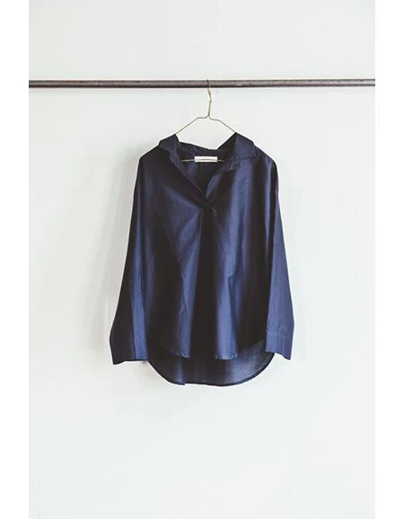 Nail tunic is a shirt collar tunic with opening on the front. The shape is slightly A-shaped and the back is slightly longer than the front. In dark blue color.Â
