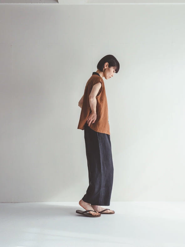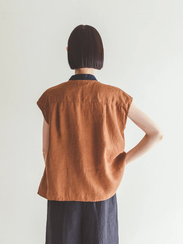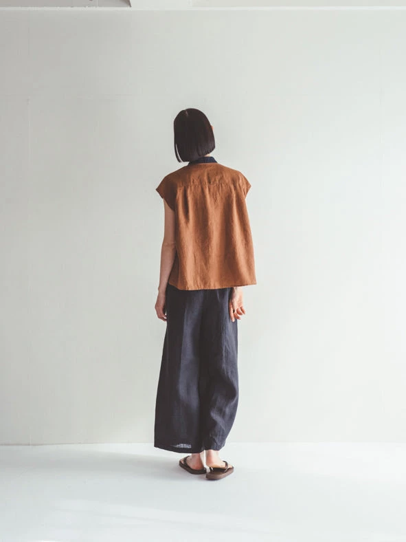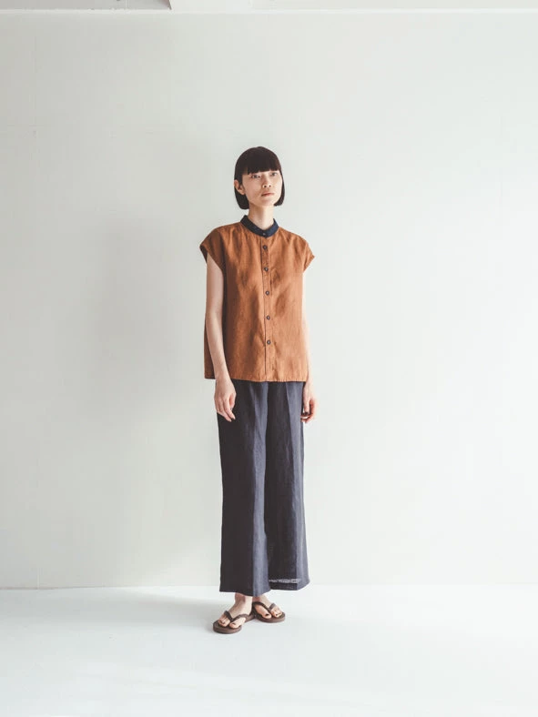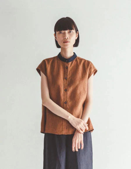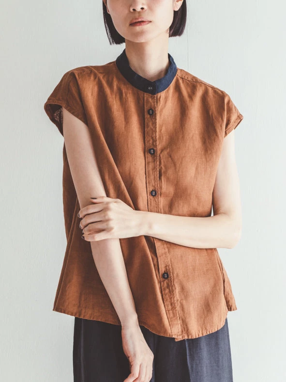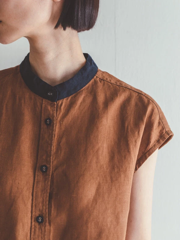 A tailored linen shirt featuring an accent color collar and buttons at the front.
