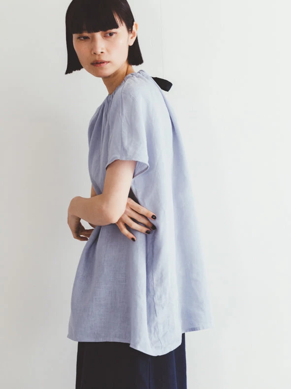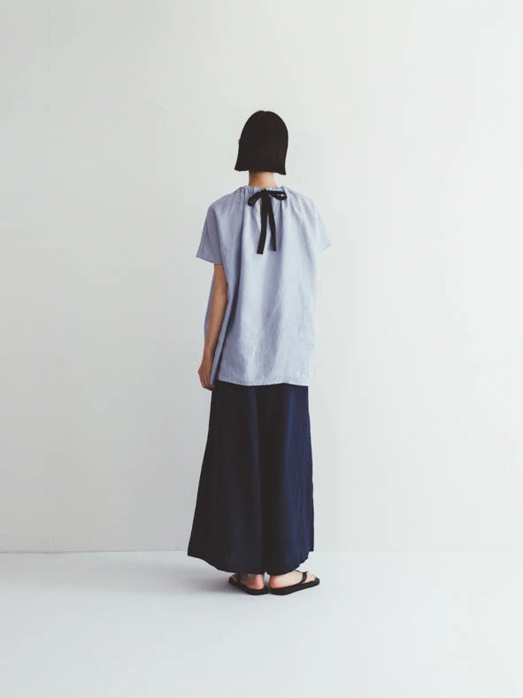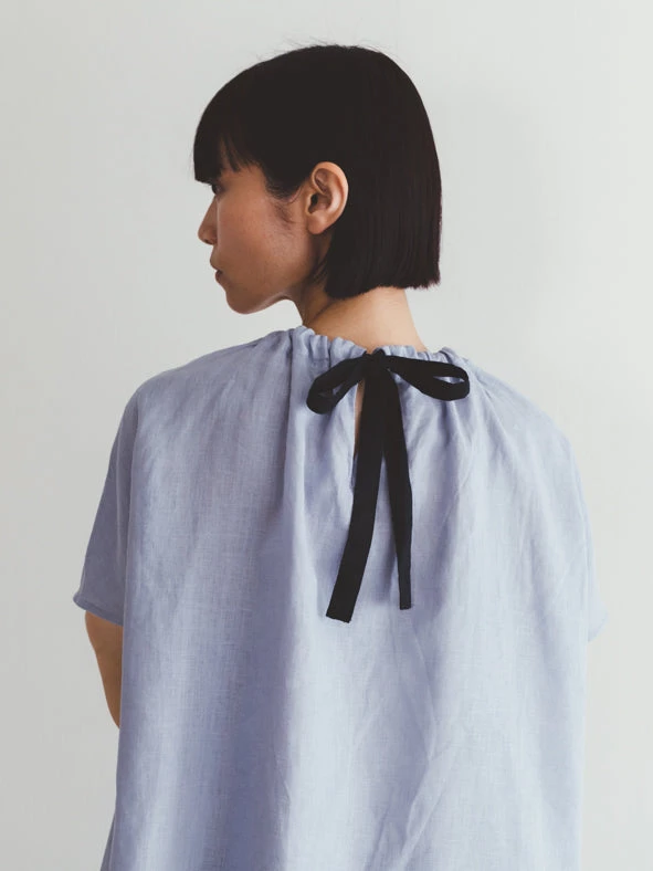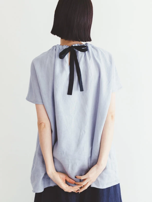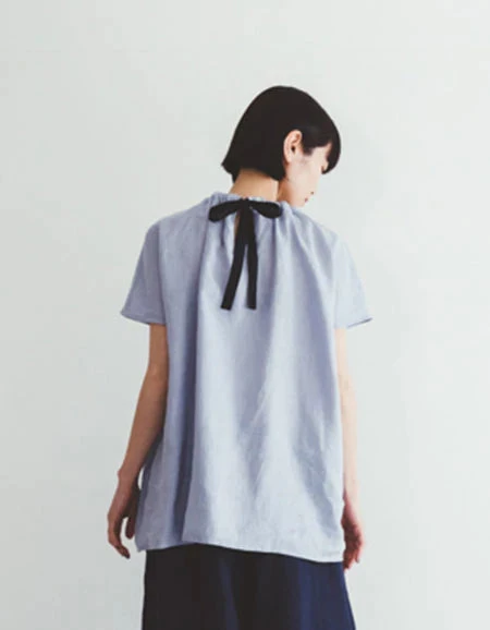 A slightly longer top with an accent-colored ribbon around the neck and ties at the back.