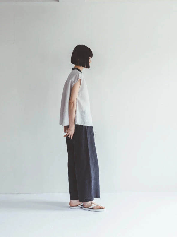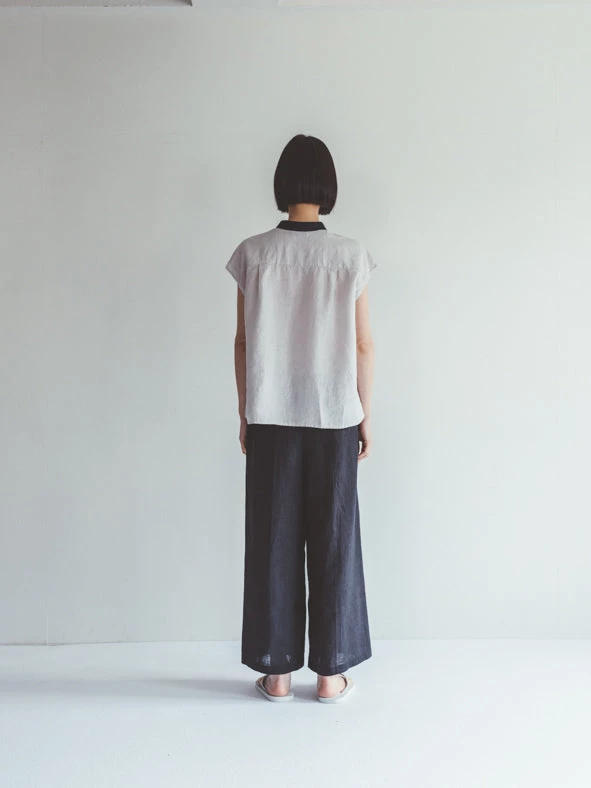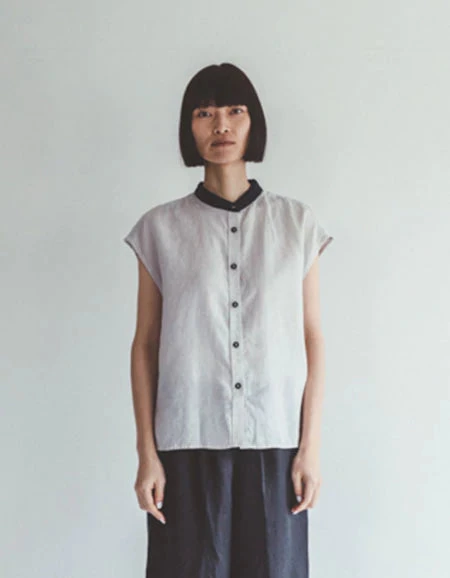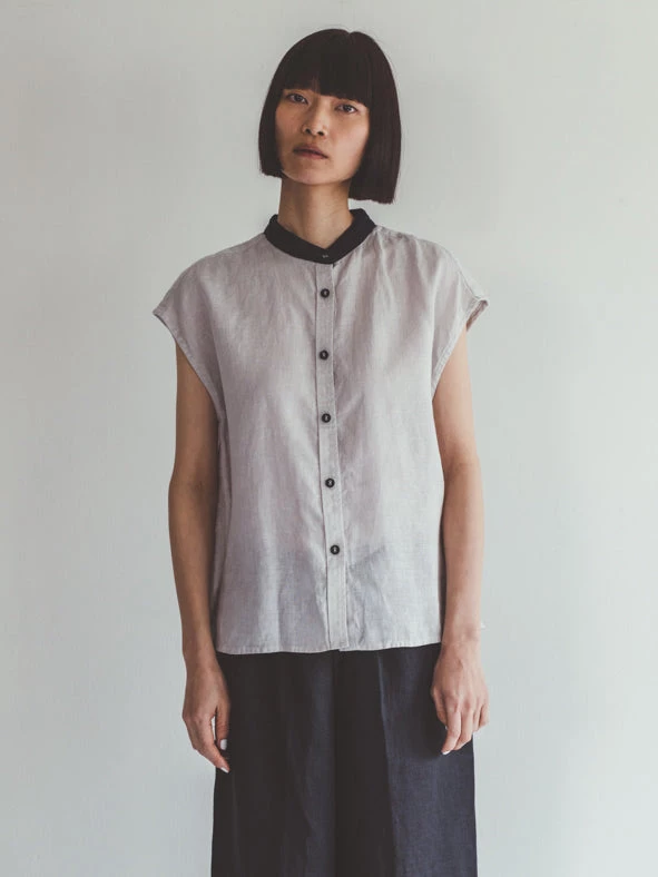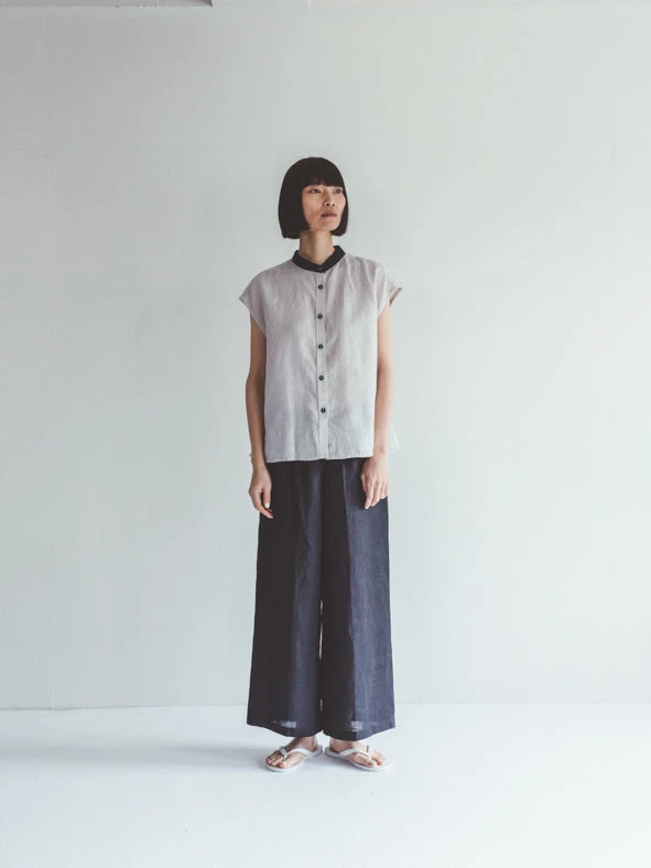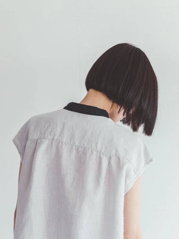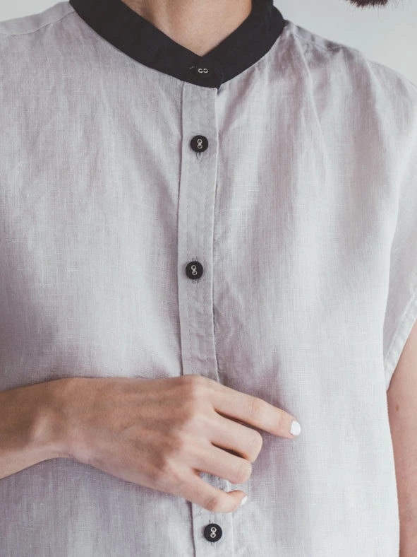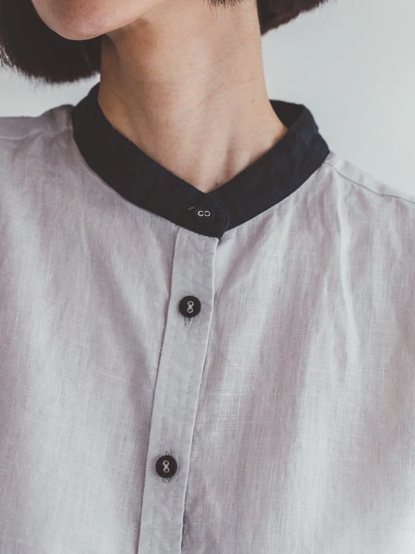 A tailored linen shirt featuring an accent color collar and buttons at the front.