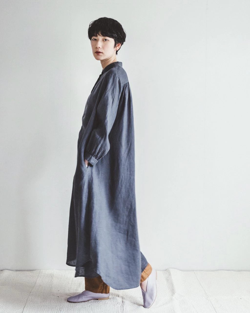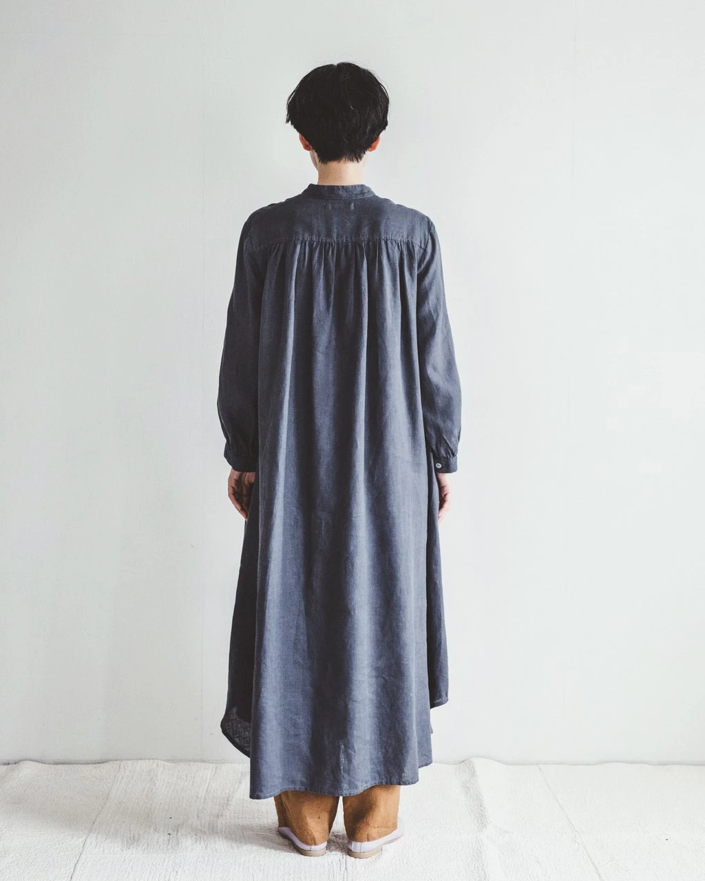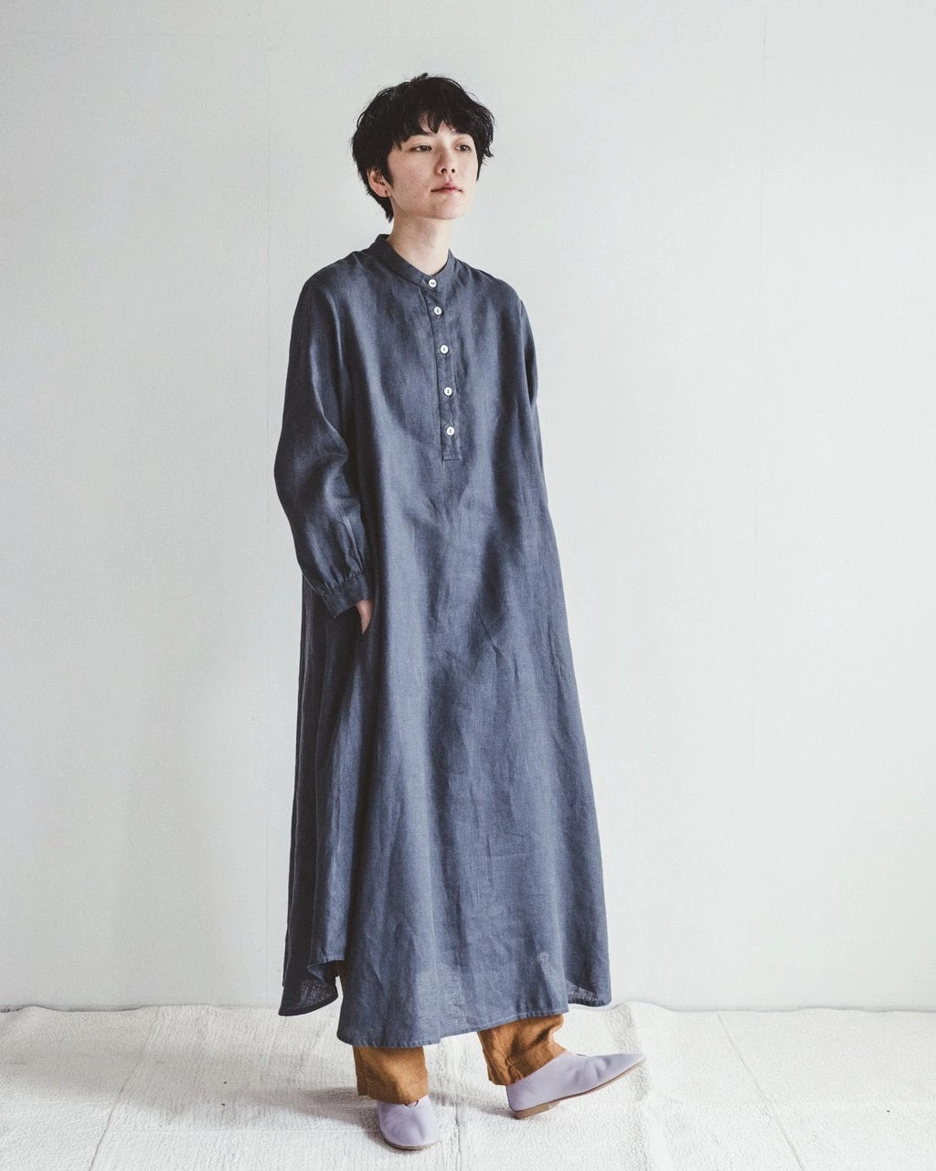 Caroline is an a-line tunic dress with lots of room in the body, featuring a banded collar with a five button placket and a shirt tail hem. Long sleeves with a shell button and pleating at the cuff. Side pockets. In a lightweight linen.