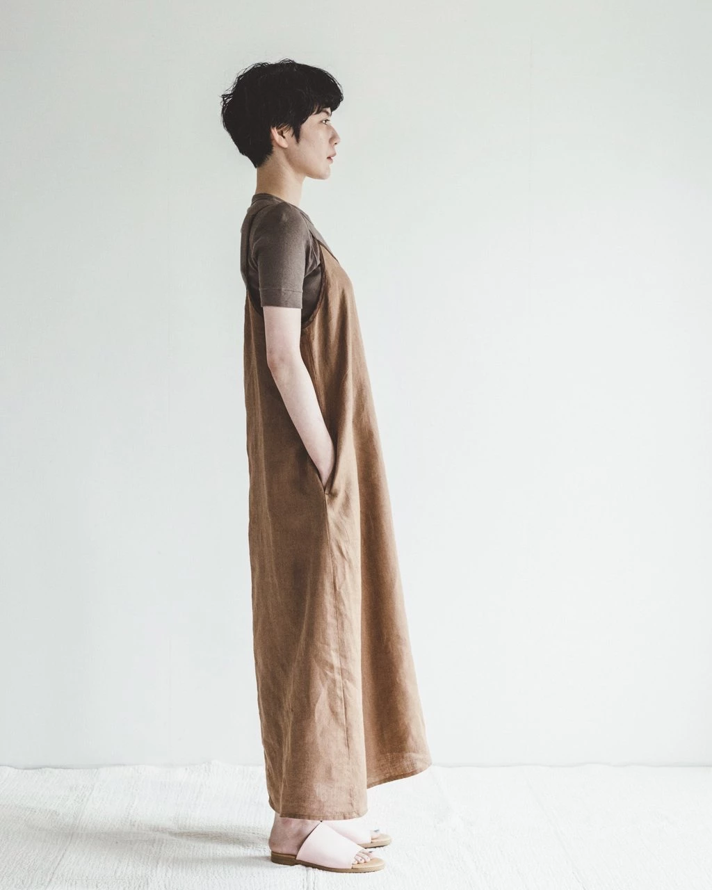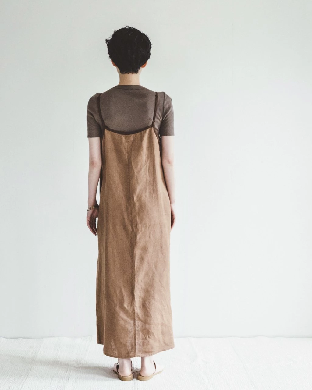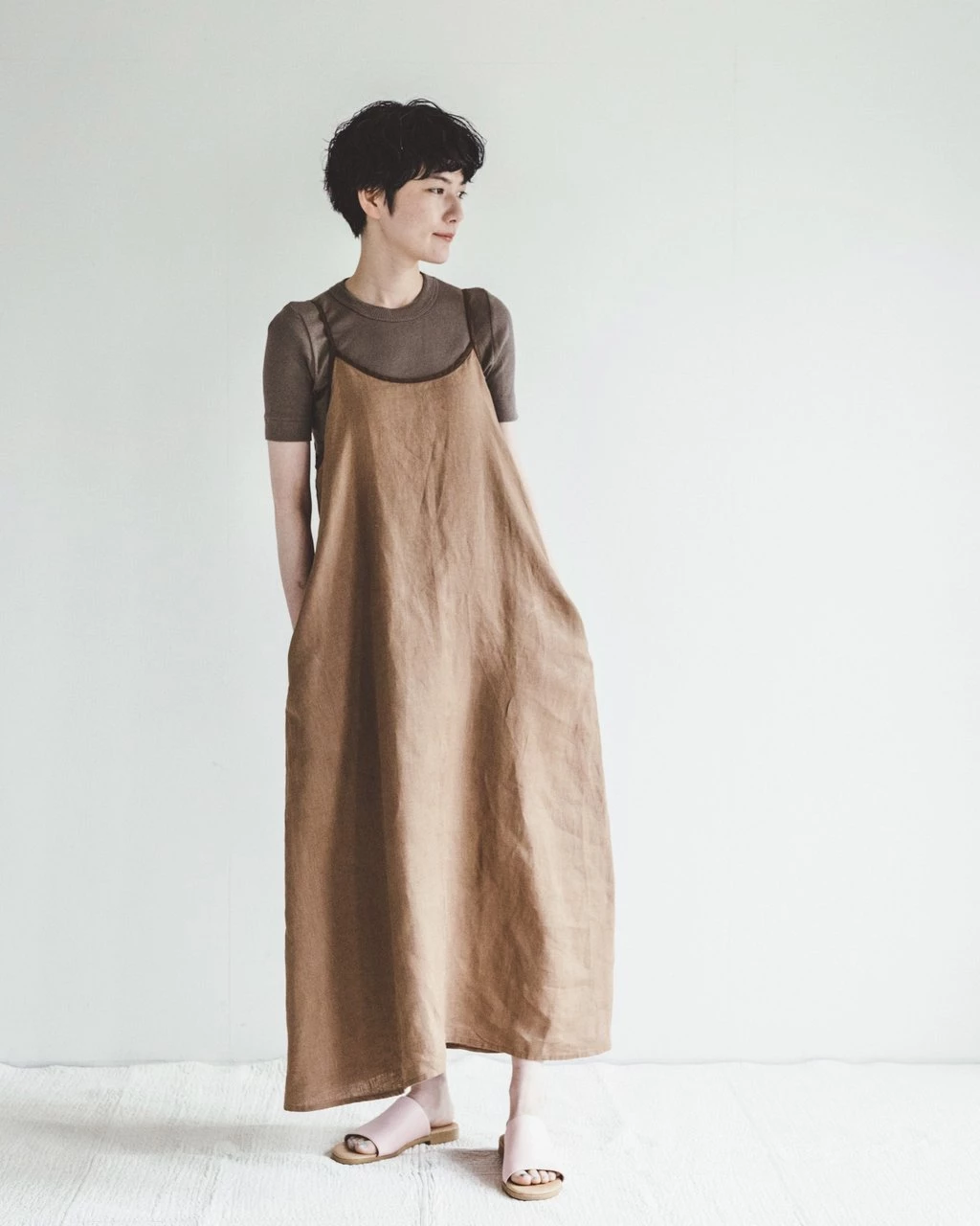 Piper is a slip dress with a long a-line shape and side pockets. Contrasting trim on the (lingerie-style) adjustable shoulder straps and along the neckline. Great for layering over long sleeves or tights on a cooler day, or wear it over a tee or tank on a hot one. In a mid-weight linen.