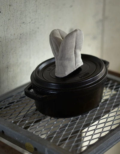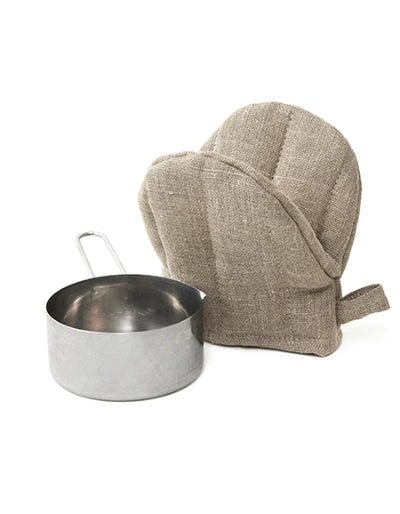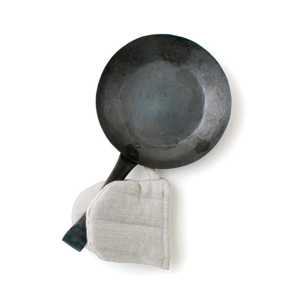 A compact, quilted linen mitt designed to protect fingers and palm.