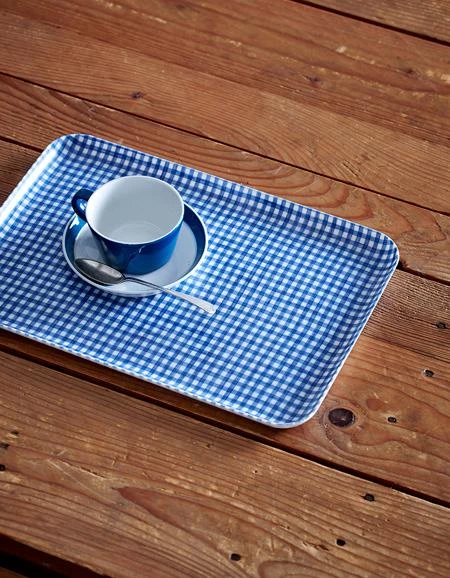 Useful, light-weight serving trays made from linen that has been covered in a poly resin.