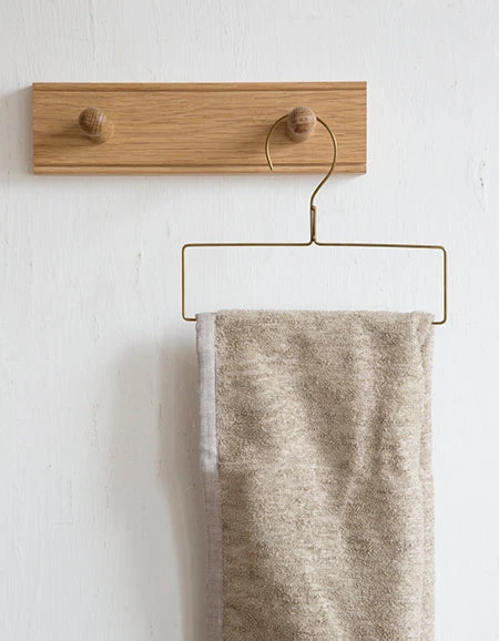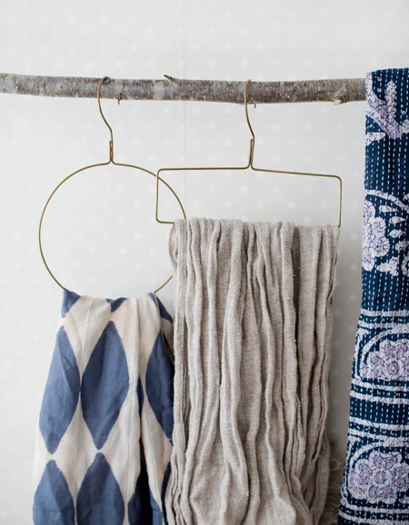 Hand-wrought brass hanger to accommodate ties or lighter scarves.